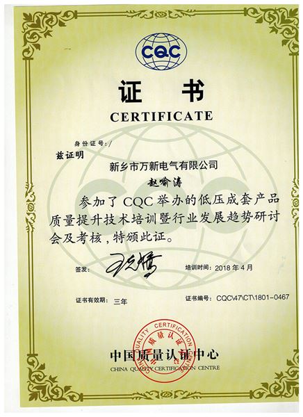 2018年4月,萬新電氣趙喻濤、趙華鋒參加CQC舉辦的低壓成套產(chǎn)品質(zhì)量技術(shù)提升培訓(xùn)及行業(yè)發(fā)展趨勢研討會并通過考核取得證書。