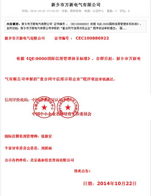 【新聞動(dòng)態(tài)】萬(wàn)新電氣--重合同守信用示范企業(yè)
